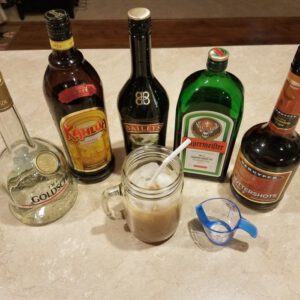 Kahlua Baileys irish cream Butterscotch schnapps Jagermeister +1